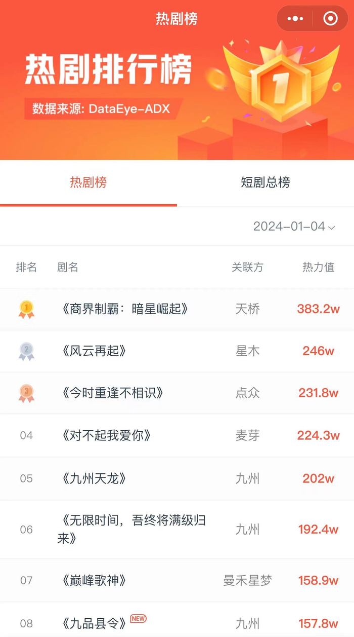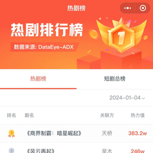 4日短剧消耗与投流日榜:商界制霸·暗星崛起排名第一 Bianews 2024.01.0518:22 关注 编者按:为帮助从业者提供更多信息,专注于短剧报道的新腕儿和科技媒体鞭牛士联合ADXray共同推出短剧消耗日榜和投流日榜。 短剧消耗热力值日榜来源ADXray,仅供参考。