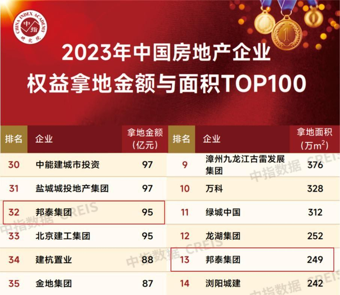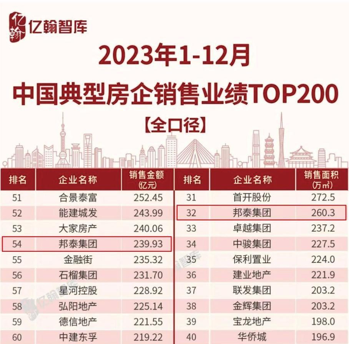 2023年,邦泰活跃在土地市场,共获取优质土地21宗,位列2023年中国房地产企业拿地面积第13名,拿地金额第32名(数据来源中指研究院);不仅如此,邦泰在销售端也收获了亮相表现,位居2023年中国典型房企销售面积第32名,销售金额第54名。(数据来源亿翰智库)