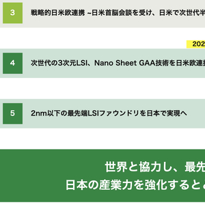 为此,其中长期(2020年代后)的事业发展构想是,通过与美欧等合作,推进面向下一代半导体制造技术的发展,希望在日本本土实现2nm制程以下的先进晶圆制造。以此强化日本的产业力量,引领世界制造业。