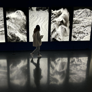 成都市美术馆,一名观众走过“无界·无限”摄影展上的《冰川》组照