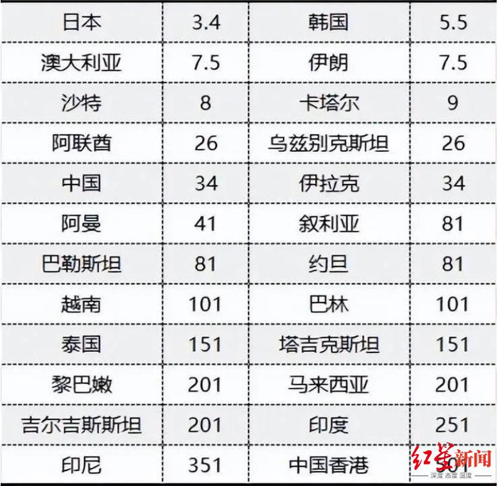 在相关机构公布的亚洲杯夺冠指数中,日本队目前以1:3.4排名榜首,韩国队1:5.5位居第二位,澳大利亚队和伊朗队均为1:7.5,并列第三位。之后是沙特队(1:8)、卡塔尔(1:9),这六支位居第一集团的球队被认为是最有希望冲击冠军的球队。后面的阿联酋队、乌兹别克斯坦队的夺冠指数已经高达1:26,和第一集团出现了断层的差距。而国足目前以1:34与伊拉克队并列第九位,高于近期热身赛上击败过自己的阿曼队(1:41)以及同组的塔吉克斯坦队(1:151)、黎巴嫩队(1:201)。
