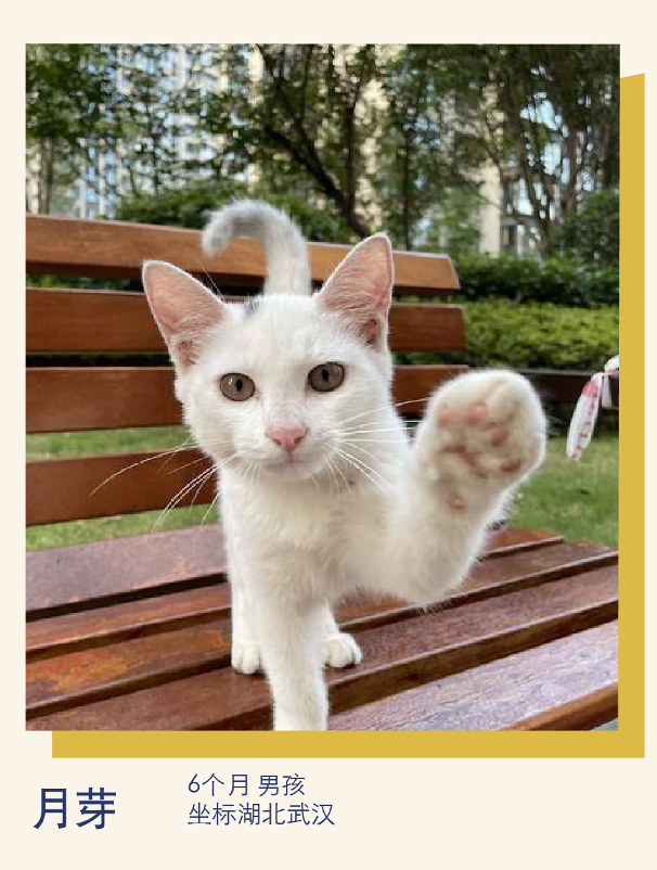 救助经历:月芽是因为头顶有块月芽一样的灰毛而得名,是小区最帅的流浪猫之一。性格亲人可爱,活泼开朗,目前已完成驱虫、疫苗、绝育,在中转家庭中等待领养。希望能够尽快找到宠爱月芽的有缘人,给它独一无二的爱,大耳朵月芽超级有福气,它一定会治愈你的所有时刻。