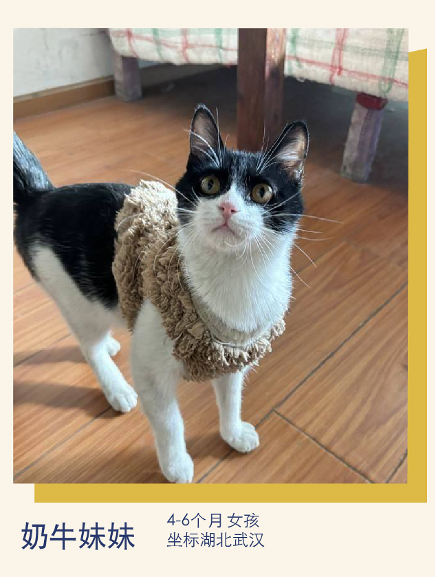 救助经历:妹妹是在一个下雨天“碰瓷”救助人,得以进入中转家庭的。它很亲人,聪明、活泼,身体健康,已驱虫已打狂犬,新手或二胎家庭都适合。希望遇到爱猫猫的你,与奶牛妹妹共度以后的。