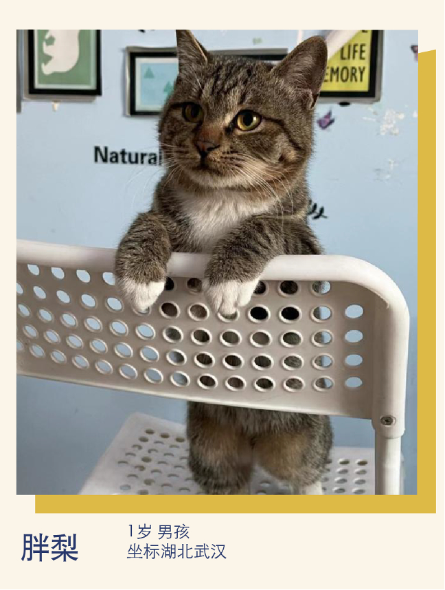 救助经历:胖梨是1岁左右的小男孩,被救助后已经完成驱虫、疫苗、绝育,它性格亲人、温顺,总爱偷偷观察人类的一举一动然后找准时机让你陪他玩耍,生活习惯良好,是很适合进入家庭的一只有猫德的小猫!