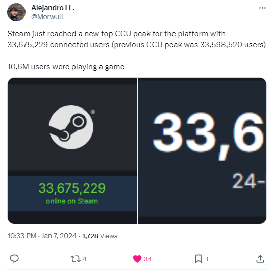 这个数据突破了去年1月3359万人的Steam在线记录。之所以有如此多玩家在线,与最近的Steam冬促有关,也侧面反映了近几年Steam用户不断增加的趋势。