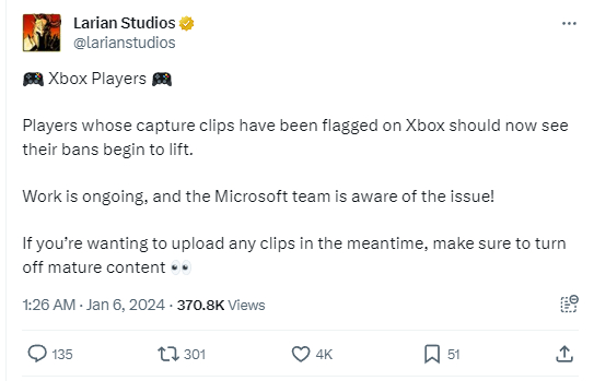 还记得上周Xbox用户账户被封禁事件吗?当时,一位Xbox玩家称,自己在游戏中截取《博德之门3》成人内容片段,却被Xbox系统截取视频后自动上传,导致账户被官方判定上传“限制级内容”,遭封禁一年惩罚。该用户在Reddit上吐槽了自己的遭遇,结果发现许多用户都是受害者。