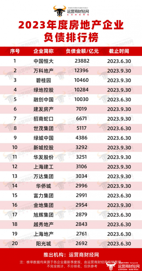 5家负债上万亿!运营商财经网推出“2023年度房地产企业负债榜”