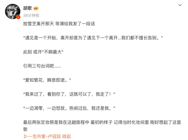 作为《繁花》中唯一的男主角,宝总的扮演者胡歌也在今晚写下“小作文”来与这部剧、这个角色告别:“拍雪芝离开那天,导演给我发了一段话:‘遇见是一个开始,离开却是为了遇见下一个离开……我们都不擅长告别。’此刻,或许‘不响最大’。”
