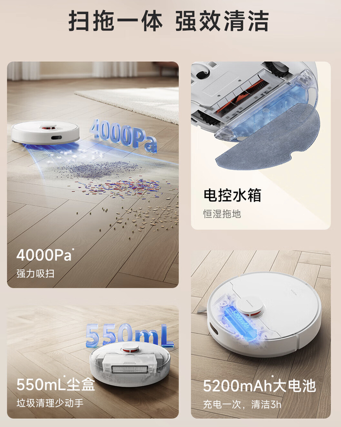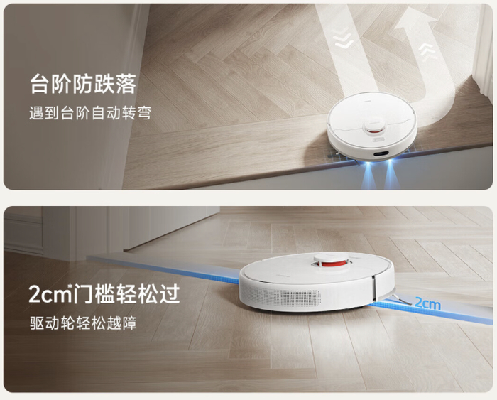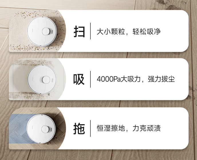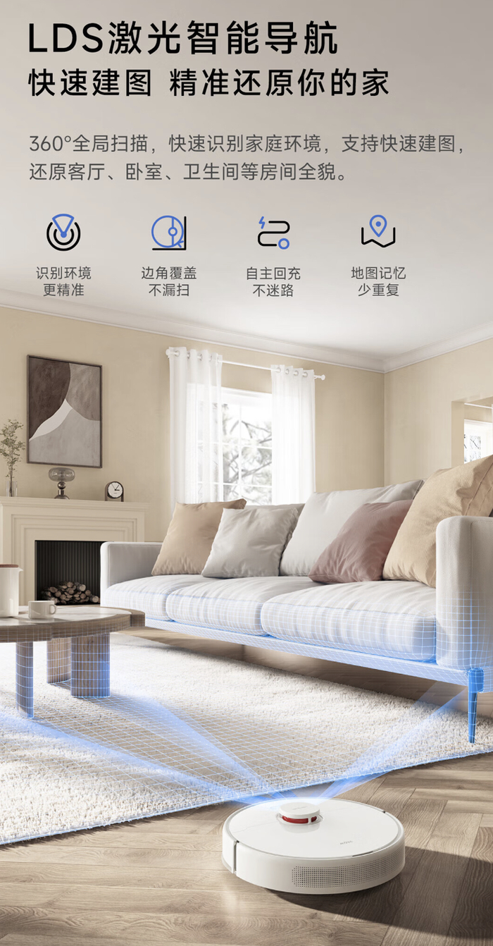 官方介绍称,这款机器人支持单扫、单拖、扫拖三种清洁方式,搭载 4 档吸力模式,配备胶毛一体滚刷、智能电控水箱、LDS 激光导航,支持 2 cm 越障、台阶防跌落功能。