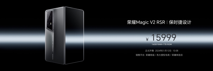 荣耀Magic V2 RSR保时捷设计售价为15999元,将于2024年1月12日10:08在荣耀商城、各大授权电商、荣耀体验店、保时捷中国官网、授权保时捷中心正式开售。