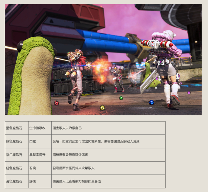 此外还有魔晶石,作为武器配件刷新在地图上。每种魔晶石都会为武器附加特殊的效果,比如吸血、释放暴击、召唤兽等等,供玩家们把FPS玩成RPG。