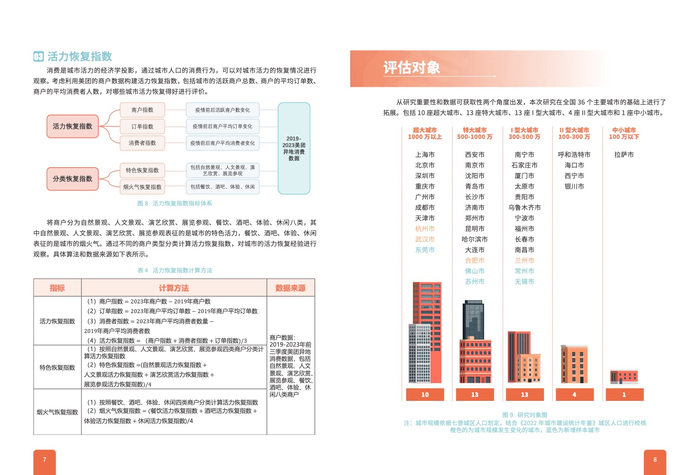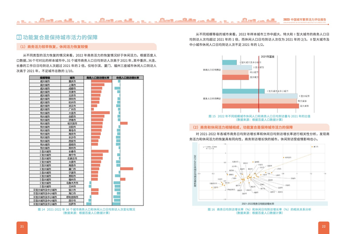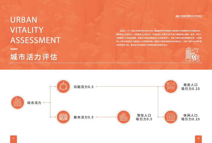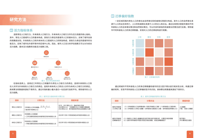 选取常住人口吸引力、外来商务人口吸引力、外来休闲人口吸引力作为活力测度的核心指标。 其中,常住人口是城市人口的基本构成,其吸引力表征的是城市人口的基本活力,反映了城市自身 的规模成长性;外来商务人口和外来休闲人口是城市人口的附加构成,其吸引力表征的是城市的功 能活力,反映了城市在外部环境中的区域中心性。因此,城市人口活力的评估指数又可以分为综合 活力指数、基本活力指数和功能活力指数三类。