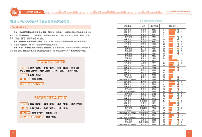 华南、西南地区城市综合活力减弱。成都、广州、深圳三个超大城市排名分别下滑至第6、7、 10,其他城市除重庆、海口外,也都出现不同程度的下降 华北、东北、西北地区城市综合活力有所回升。