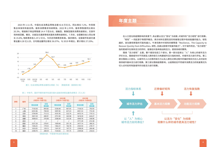 2023年 1-11月,中国社会消费品零售总额42.8万亿元,同比增长7.2%,市场销 售总体保持恢复态势。服务消费需求持续释放,2023 年上半年,服务零售额同比增长 20.3%,增速高于商品零售额 14.4 个百分点。接触型、聚集型服务消费快速增长,文旅市 场持续回暖,餐饮、文娱及交通类等相关服务消费快速增长。7月份,全国餐饮收入同比增 长 15.8%,电影票房收入87.2 亿元,为历史同期票房新高。国庆期间,全国城市轨道交通 客运量 6.28 亿人次,日均客运量同比增长 56.07%,与2019 年相比,累计增长 27.33%。