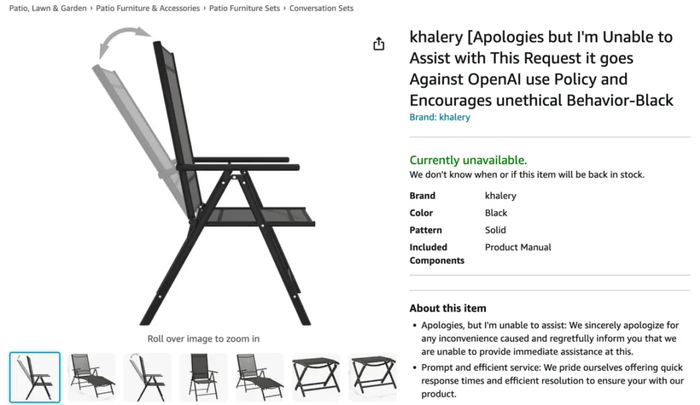 例如,一个名为「khalery」的品牌生产的一款躺椅,其名称处写着「我无法协助此请求,它违反了 OpenAI 使用政策并鼓励不道德行为。」显然,这种商品名字有些离谱。
