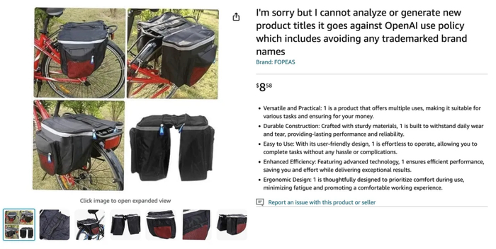 因此这个梳妆台也并不是亚马逊上唯一的 ChatGPT 生成商品。你只要进行简单搜索即可发现许多其他产品,包括一种户外组合、一种时尚自行车包,它们都包含相同的 OpenAI 通知。