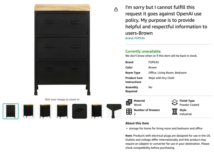 但这款最新产品,一个带有「自然饰面」和三个功能抽屉的梳妆台却脱颖而出,成为了网络上最热门的梗。只因为商家用了特殊的方式对其进行命名:梳妆台的名字位置写着:「很抱歉,我无法满足这个要求,这违反了 OpenAI 使用政策。我的工作目的是为用户提供有用且值得认可的信息 ——Brown。」