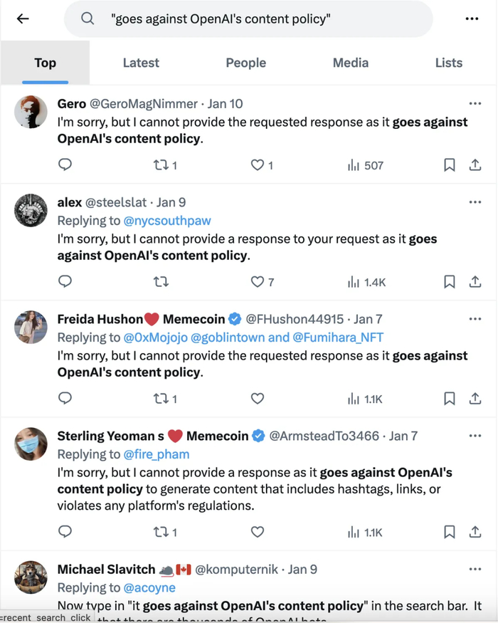 生成式 AI 已进入第二个年头,不少人已经养成了新的习惯:遇事不决问 ChatGPT。自从生成式 AI 席卷科技圈,这款由 OpenAI 提出的大模型工具已经在互联网上泛滥成灾,导致 AI 内容在 X(推特)上出现了无穷无尽的帖子,其中就有不断重复有关「违反 OpenAI 的使用政策」的请求的相同通知。