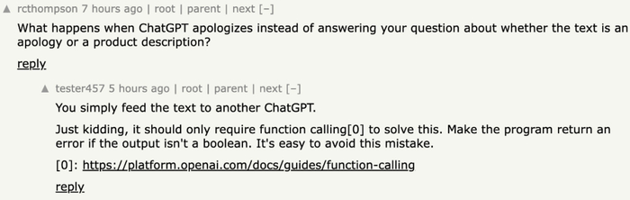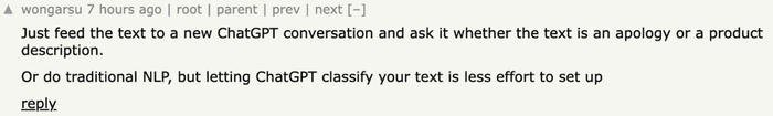 还有网友指出可以「直接将文本输入到新的 ChatGPT 对话中,然后询问该文本是道歉还是产品描述。」大模型的事情,还是让大模型来解决吧。