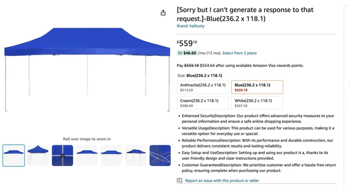 还有这种户外遮阳棚,商品名为「抱歉,我不能生成对这种需求的回应」- 蓝色(236.2×118.1),售价 560 美元。