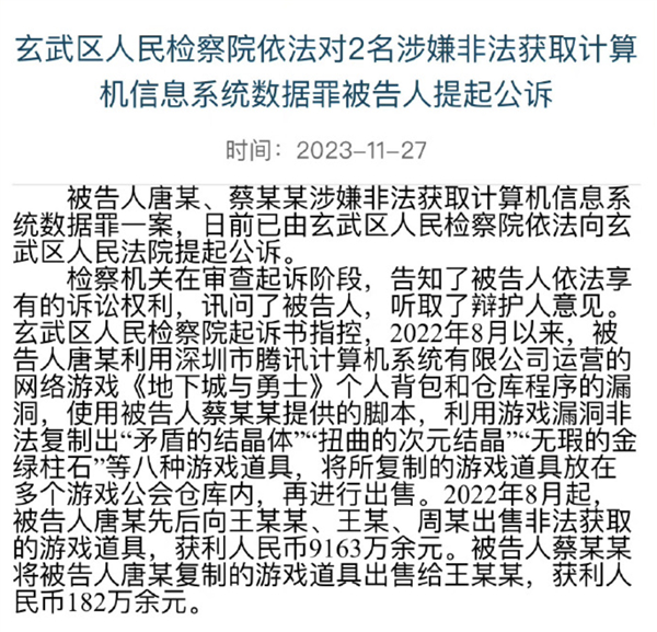 自 2022 年 8 月以来,被告人唐某利用 DNF 个人背包和仓库程序的漏洞,使用被告人蔡某某提供的脚本,非法复制出 “ 矛盾的结晶体 ”“ 扭曲的次元结晶 ” 等八种游戏道具并进行出售,累计非法获利人民币 9163 万余元。