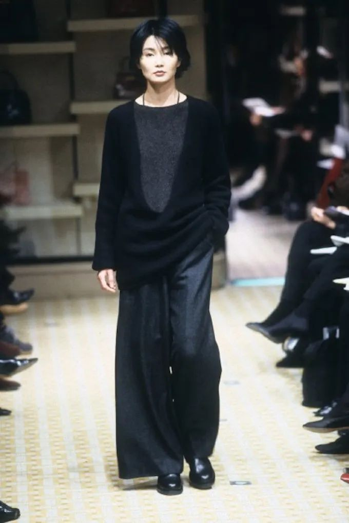 这种内核最好的诠释,是1998年张曼玉为爱马仕走秀时身着的那套All Grey。这套穿搭通体深灰,柔软的针织没有任何棱角,但是依旧穿得冷清笃定、气场强大。