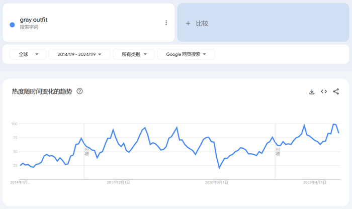 再看国外,格雷风刮得也很猛烈。谷歌趋势显示,过去10年里,每到秋冬季节格雷风的搜索量都会激增,在2023年12月更是达到历来最高值。
