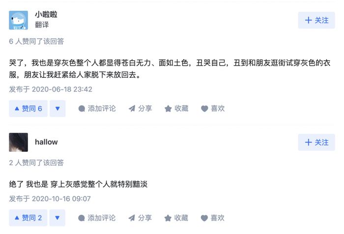 2020年就有人在知乎上发问,为什么有些人穿灰色不好看?回答里不少人都感同身受,一穿灰色,整个人都变黯淡了。