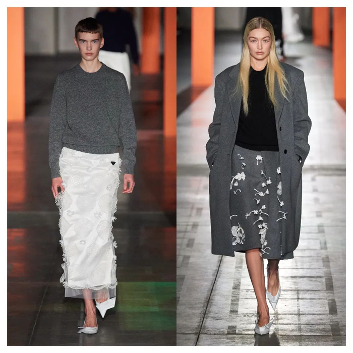 而她的大姐,也就是知识分子最爱的Prada,也在2023年秋冬系列里把深灰色玩出了花,极具松弛感的灰色圆领套头毛衣,搭配轻盈的白色半身裙,再外加一件灰黑色的大衣或者夹克,智性的姐系气质轻而易举就拿捏住了。