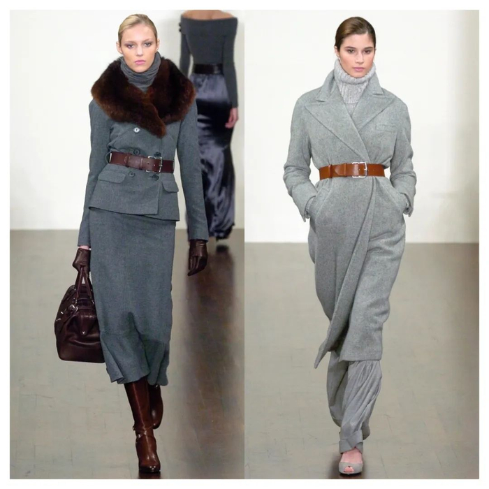 这样的细节亮点可以是不同的材质。比如老钱风的代表Ralph Lauren曾经做过一季经典的高级灰。在其中用毛茸茸的皮草,还有硬挺具有光泽的皮靴、皮包、皮带制造小冲突来调和全身都是灰色的单调。