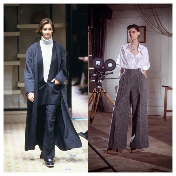 Hermes1998年秋冬系列里这一套用低饱和度的浅灰色高领打底衫衬托脸部肤色,外部叠加两种不同深灰色增加层次感,套衫深V的设计还拉长了颈部线条,即使穿高领也会显得脖子纤长。