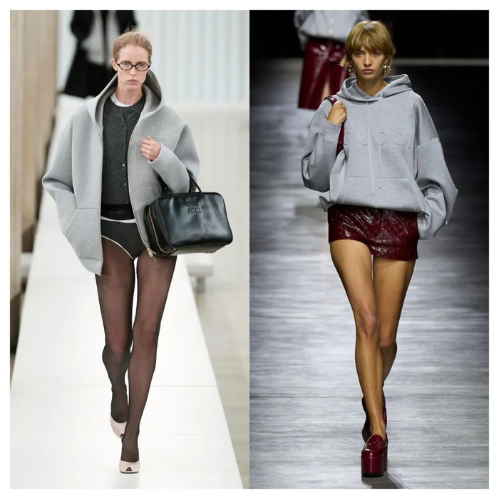 我们以Gucci和Miu Miu为例来看看质量好的灰色卫衣该是什么样。仔细看这些卫衣,版型非常正,松量合适,领口帽沿位置合理,版师在模特身上经过多次调整才能达到这样的效果。而且只有用非常厚实的棉布才能纺出这种有廓形还带微微光泽的质感。