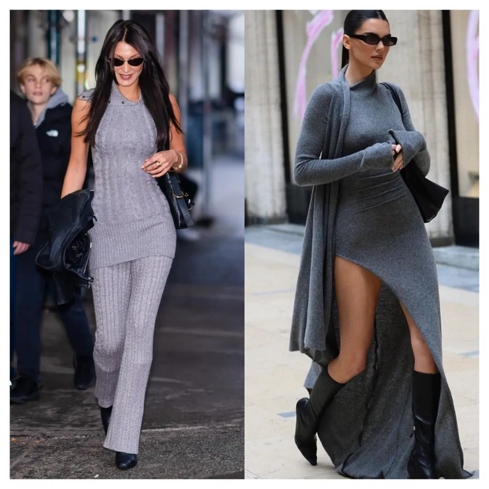 比如两位超模Bella和Kendall穿着尽显身材曲线的灰色裹身连衣裙,给人的感觉是女性的自信甚至有些嚣张的“性感”。