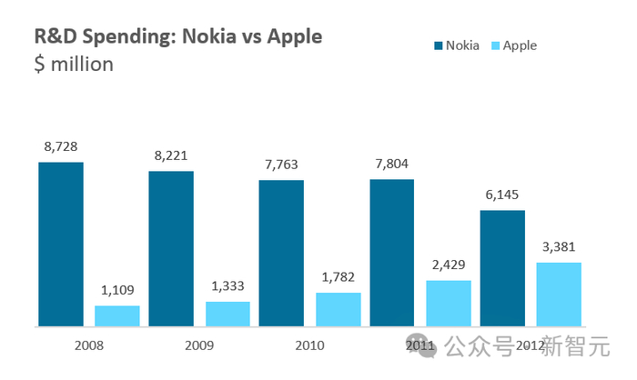 拿一个例子来说:尽管诺基亚以 39% 的市场份额坐拥全球领先地位,并且在 iPhone 面市之后的几年里,研发投入是苹果的四倍(3.85 倍),但它最终还是败给了苹果,并在 2013 年,被迫退出了手机市场。