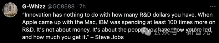 随后,也有网友抛出了乔布斯的名言:「创新与你的研发投入多少并无直接关系。当苹果发明 Mac 的时候,IBM 在研发上的投入至少多出 100 倍。」