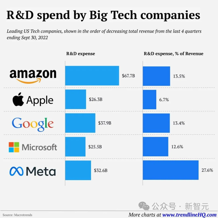 根据 2022 年的科研经费排行榜,亚马逊、谷歌、Meta 获得前三,但要论科研经费占收入比,Meta 和英伟达则分别以 30%、27% 获得 TOP 2。