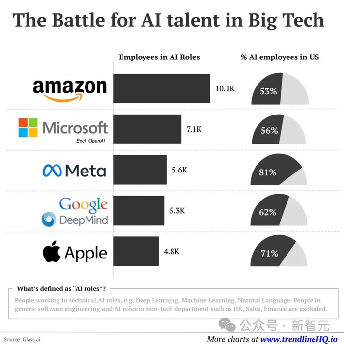 几乎和研发投入的趋势一样,亚马逊拥有最多的 AI 从业人员(超过 1 万人),而 Meta 依然是占比最高(81%)。