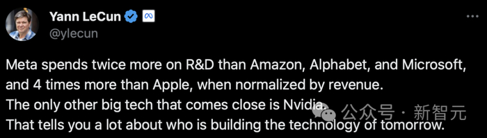 对此 LeCun 表示,Meta 的研发支出占总收入的比值,是亚马逊、谷歌和微软的 2 倍,更是苹果的 4 倍!