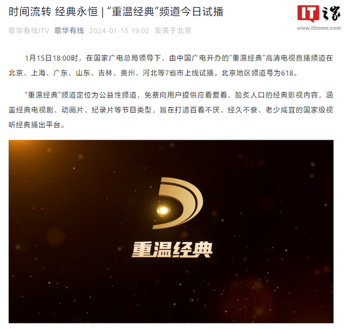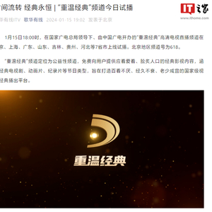 IT之家 1 月 16 日消息,据“歌华有线”公众号,1 月 15 日 18:00,在国家广电总局领导下、由中国广电开办的“重温经典”高清电视直播频道在北京、上海、广东、山东、吉林、贵州、河北等 7 省市上线试播,北京地区频道号为 618。