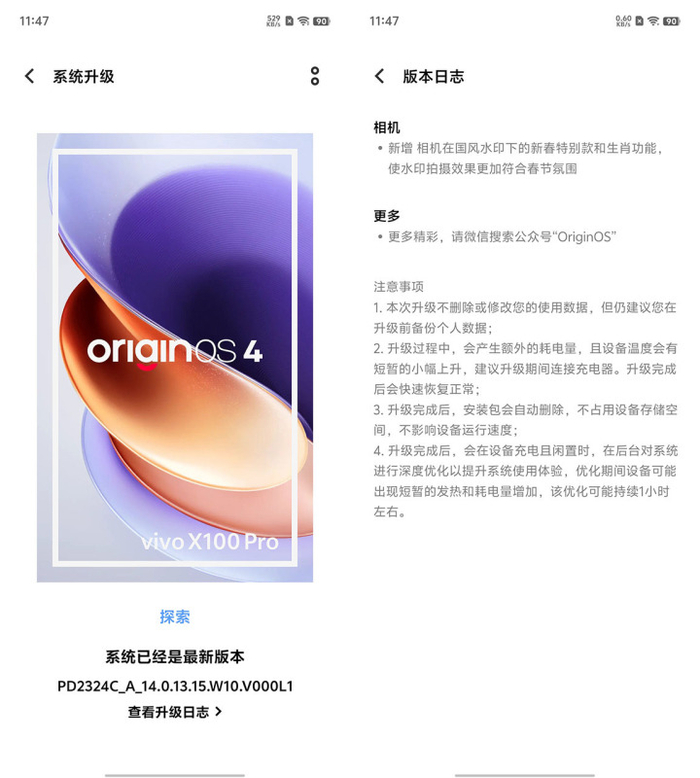 1月15日,vivo X100系列更新了系统,新系统在国风水印中,提供了新春特别款和生肖功能,使水印效果能够更加符合春节氛围。