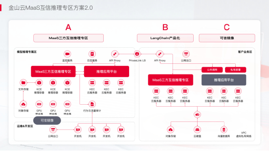 此外,为解决云厂商与大模型企业间的可信交互问题,金山云还推出了互信虚拟私有网络,对进出VPC的通信行为有着更为严格的控制,帮助客户解决合规和互信问题。与此同时,金山云还发布了MaaS互信推理专区方案2.0(MaaS 2.0),可实现云上LangChain的一键部署,默认对接多个生态合作商业大模型和开源大模型。