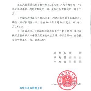 据此,2023年12月29日,丰泽法院一审判决被告人黄某某犯拒不执行判决、裁定罪,判处有期徒刑一年;犯寻衅滋事罪,判处有期徒刑一年,决定执行有期徒刑一年十个月。