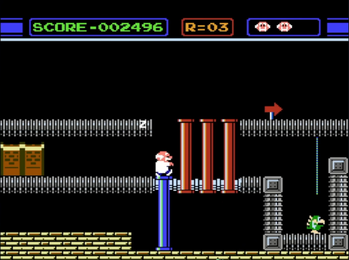 《Gyromite》的B模式,理论上只需要手柄上的A和B两个按键就能畅玩。在游戏中,一位梦游的科学家会自动向右移动,而路径上的管道和怪物会拦住去路。玩家需要及时按下按钮,升高或降低管道,引导科学家穿过实验室中的一个又一个关卡。