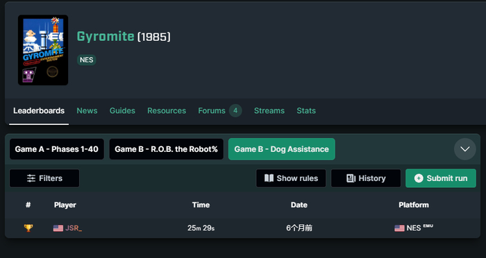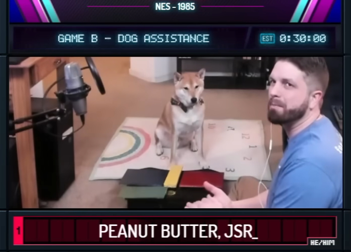 这只柴犬叫做“花生酱”(Peanut Butter,PB),他的主人是JSR,也是一位速通玩家。他们两个合作速通了NES游戏《Gyromite》的B模式。