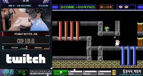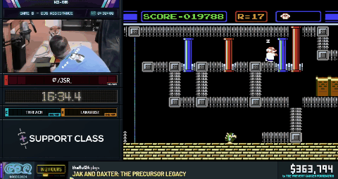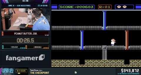 JSR惊呼,“这在以前从未发生过”。这句话已经成了AGDQ的名言,因为现场直播确实会意外频出,还总是些练习时从未碰到过的岔子。《Gyromite》游戏本身结束后不允许重开,在科学家的三条生命损失殆尽后,经主办方允许,JSR使用了模拟器的读档功能,一命通过了接下来的流程。