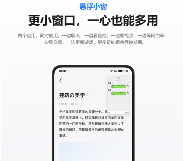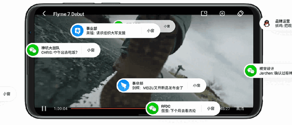 魅族把小窗的理念拿了过来,但基本上等于重新设计了小窗的功能和操作逻辑。Flyme 7 发布会,魅族的小窗模式的首次亮相,便捷了 QQ 、微信等热门社交应用的消息回复操作,在当时,即用即走的逻辑就已经定调。