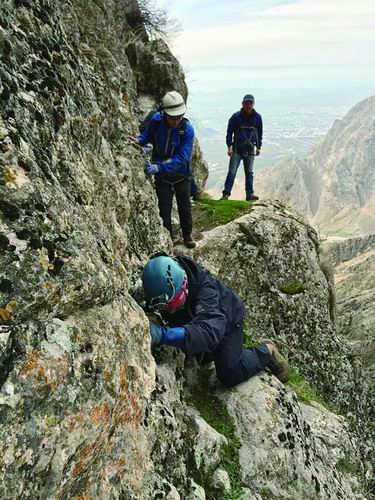 探洞不仅需要强大的心理素质,还得有一副好身板。从洞口出来的每个人都背着几十斤重的石头样品,非常考验体力。“有一次我们在中亚吉尔吉斯斯坦出野外,有个洞在悬崖上面,需要用绳子攀岩上去,上去后还要贴着峭壁走一段路才能爬到洞口。因为小路实在太窄太陡,我们将身子贴紧峭壁,以免不小心摔下山崖。”谭亮成回忆说,上去已经很难了,下来还得背着几十斤重的样品,身体重心不稳就会被坠着后仰,而脚下就是100多米的深沟。