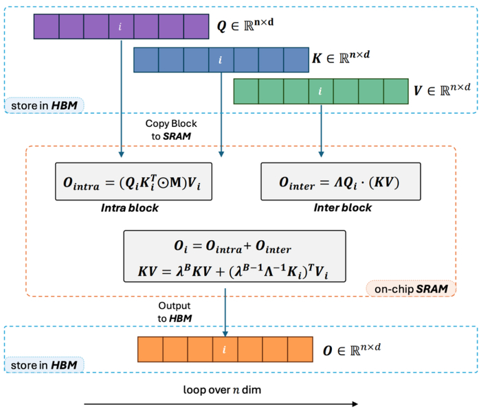 3.细心的读者会发现,以上的过程只是 Lightning Attention-2 的算法部分,之所以取名 Lightning 是因为作者充分考虑了该算法过程在 GPU 硬件执行过程中的效率问题。受到 FlashAttention 系列工作的启发,实际在 GPU 上进行计算的时候,作者将切分后的 Q_i, K_i, V_i 张量从 GPU 内部速度更慢容量更大的 HBM 搬运到速度更快容量更小的 SRAM 上进行计算,从而减少大量的 memory IO 开销。当该 block 完成 Linear Attention 的计算之后,其输出结果 O_i 又会被搬回至 HBM。重复这个过程直到所有 block 被处理完毕即可。