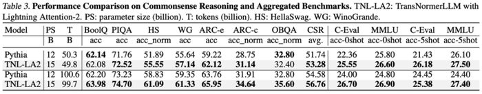 在大语言模型任务中,研究人员对比了 TNL-LA2 15B 与 Pythia 在类似大小下的大模型常见 Benchmark 的结果。如下表所示,在吃掉了相同 tokens 的条件下,TNL-LA2 在常识推理和多项选择综合能力上均略高于基于 Softmax 的注意力的 Pythia 模型。