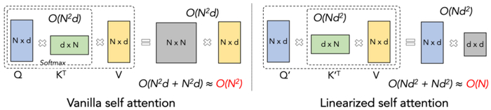 1.Linear Attention 的核心思想之一就是去除了计算成本高昂的 softmax 算子,使 Attention 的计算公式可以写为 O=((QK^T)⊙M_) V。但由于单向任务中 mask 矩阵 M 的存在,使得该形式依然只能进行左乘计算,从而不能获得 O (N) 的复杂度。但对于双向任务,由于没有没有 mask 矩阵,Linear Attention 的计算公式可以进一步简化为 O=(QK^T) V。Linear Attention 的精妙之处在于,仅仅利用简单的矩阵乘法结合律,其计算公式就可以进一步转化为:O=Q (K^T V),这种计算形式被称为右乘,相对应的前者为左乘。通过图 2 可以直观地理解到 Linear Attention 在双向任务中可以达到诱人的 O (N) 复杂度!